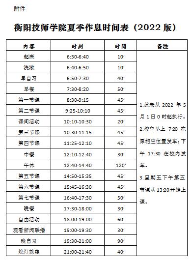 附件:衡阳技师学院夏季作息时间表(2022版)