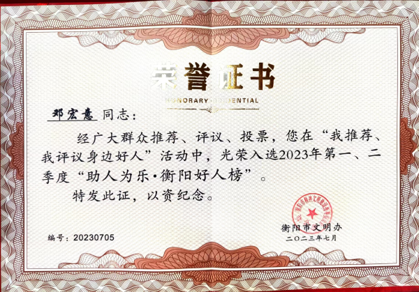 光荣入选2023年第一、二季度“助人为乐·衡阳好人榜”