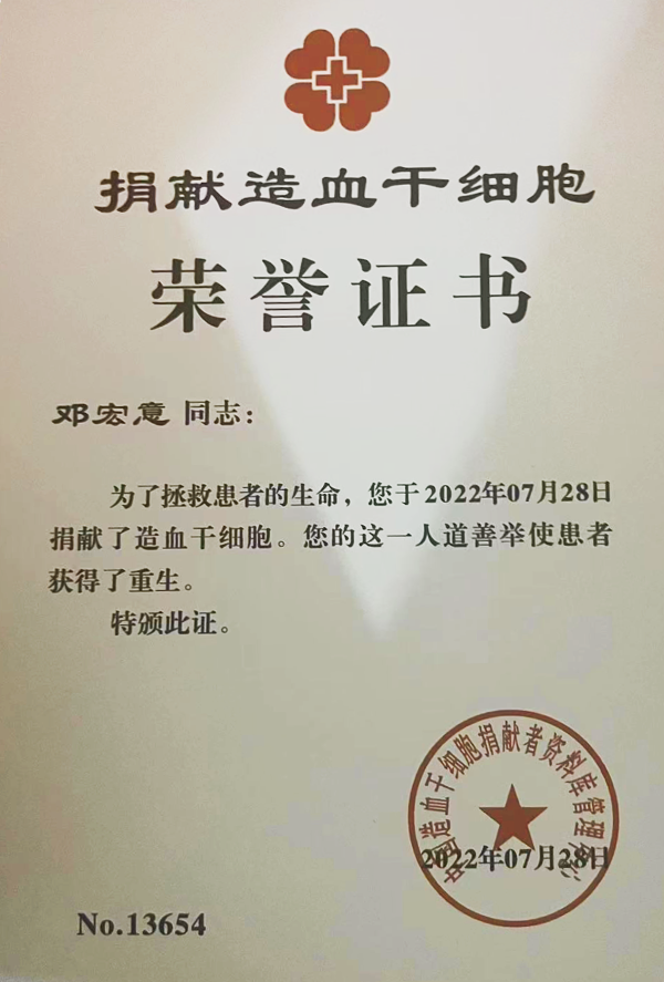 邓宏意于2021年5月加入中国造血干细胞捐献者资料库管理中心,2022年5月与杭州的一名患者匹配成功。捐献造血干细胞对于一般人来说并不是一件小事,但当管理中心工作人员找到他时,他却同意捐献。2022年6月,邓宏意体检顺利通过,2022年7月,他成功捐献了造血干细胞,为患者点燃了生命的希望。