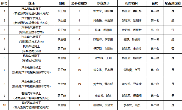 此次竞赛全省参赛人数172人次,每个赛项分教师组和学生组,每组2人。我院教师组和学生组均参加了汽车整车装调工、汽车电气装调工、机动车检测工、汽车电器维修工、智能汽车维修工等5个赛项,其中教师组荣获第一名三组,学生组荣获第一名两组,同时教师组和学生组共八组进入国赛。