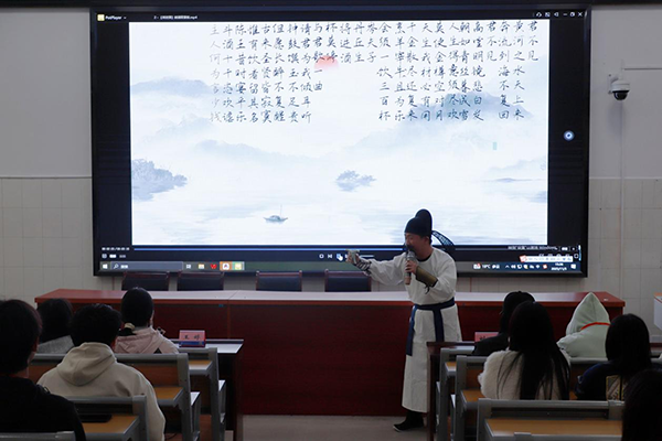 “君不见黄河之水天上来,奔流到海不复回!”宣讲团成员曾科身着古装,手持酒盏,以酣畅淋漓的演绎再现诗仙李白的豪情,在诗韵流淌与角色演绎中,将民族团结的理念融入历史情境,不仅展现了中华民族文化的多样性和包容性,更以创新的形式让“民族团结一家亲”的主题深入人心。