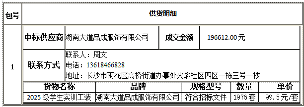 衡阳技师学院遴选2025级学生实训工装供应商公开招标采购于2026年03月05日结束,现将中标(成交)结果公告如下: