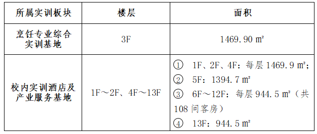 本次共建的酒店及烹饪专业综合实训基地,总建筑面积合计14830.3㎡(设计图标示面积),具体布局(见附件1:综合培训中心建筑平面设计图)、面积及所属实训板块如下: