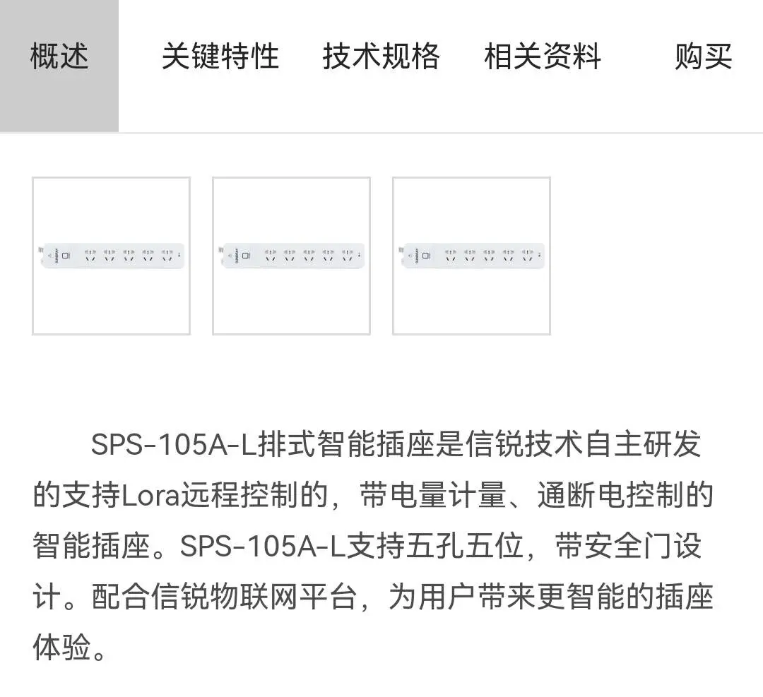 SPS105A-L智能用电管理设备厂家官网显示,这是一款具有电量计量、通断电控制功能的“排式智能插座”,支持五孔五位,带安全门设计,配合物联网平台使用,可通过app远程控制,在大功率或突增功率下自动断电和警告。