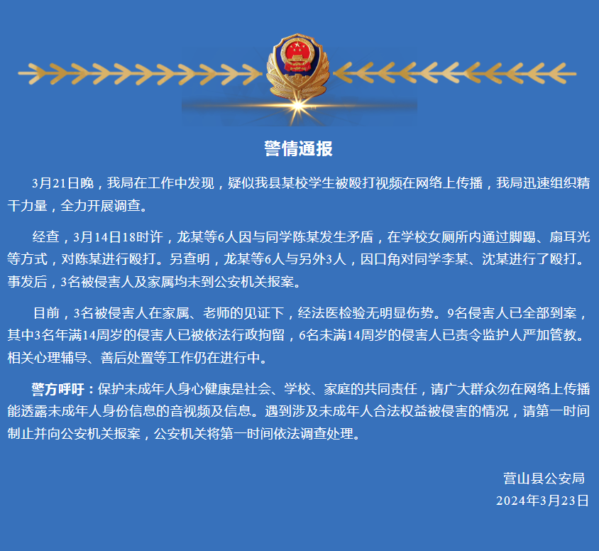 四川省营山县公安局通报“学生在女厕所被殴打”:9名侵害人已全部到案