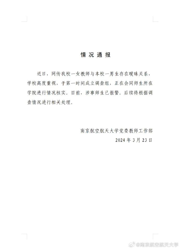 南京航空航天大学党委教师工作部关于网传女教师与本校男生存在暖昧关系的情况通报