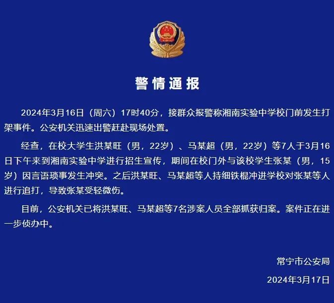 常宁市公安局关于湘南实验中学校门前打架事件的警情通报