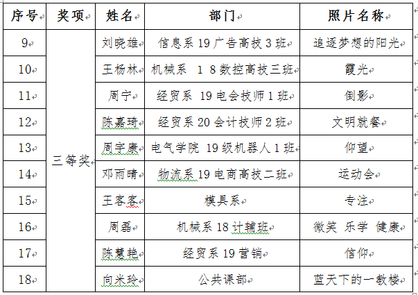 “发现文明、记录文明”和“我心中最美的校园”摄影比赛结果具体如下: