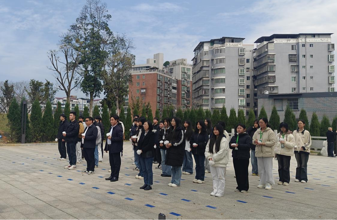 在张家山抗战遗址烈士名录纪念碑前,全体师生整齐列队,神情凝重。祭奠仪式以三鞠躬礼开场,师生集体默哀一分钟,深切悼念革命先烈。随后,马克思主义学院思政教师陈运敏深情讲述张家山抗战英烈的英勇事迹,带领师生重温烽火岁月,感悟革命精神的不朽力量。敬献鲜花环节中,师生缓步走向纪念碑,将鲜花轻轻摆放,寄托追思。
