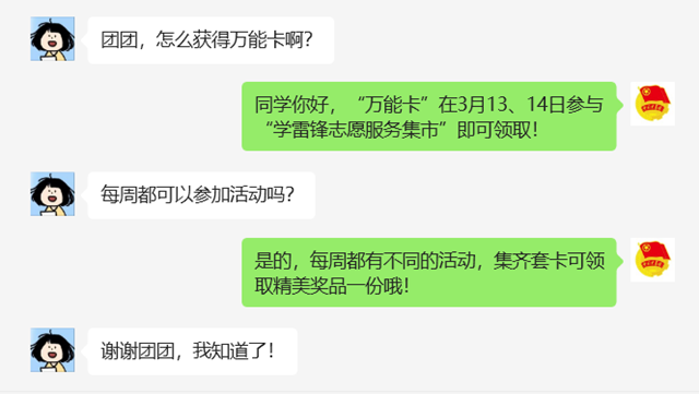 为传承和弘扬雷锋精神,培育和践行社会主义核心价值观,广泛传播“奉献、友爱、互助、进步”的志愿精神,院团委特推出雷锋月志愿集卡活动。春风十里不如学雷锋的你,快来加入我们吧!