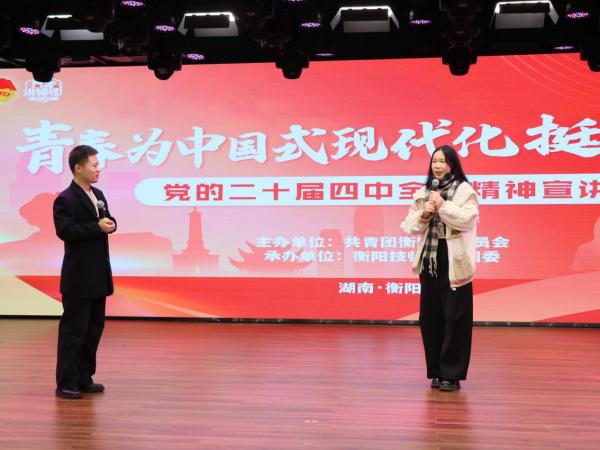 12月24日下午,“青春为中国式现代化挺膺担当——学习贯彻党的二十届四中全会精神主题宣讲”在公共实训基地11楼多功能报告厅隆重举行。衡阳市青年讲师团成员、中国共产党衡阳历史馆讲解员贺亦韬为在场师生带来了一场别开生面的宣讲,来自各二级学院青年团员和教师代表共500余人参加。