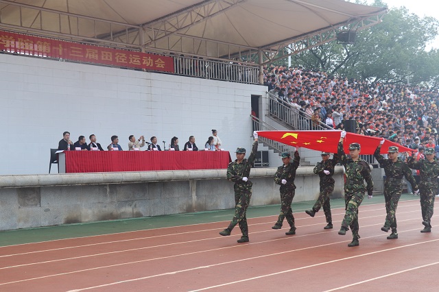 2021年10月27日”学院举行了第十三届田径运动会。入场式上,国旗护卫队走在队列的最前面,旗手们昂首挺胸高举旗帜,随后各系代表们组成了各有特色的方阵向观众们挥旗致意。