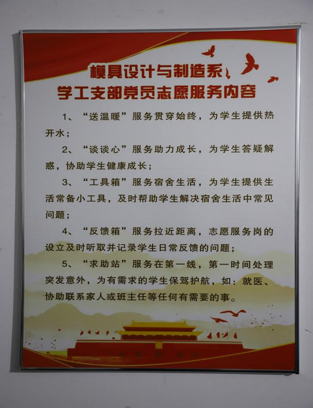 走进男生宿舍4栋1楼,“党员志愿服务岗”几个字特别醒目。模具设计与制造系努力实现“一名党员一份责任,一名党员一面旗帜”,王客客主动向组织申请住进学生宿舍,与学生同吃同住,以便更好服务于学生,为同学们解决生活、学习、思想等方面的困难,并积极动员在校学生党员和入党积极分子在晚自习下课后,坚持在服务岗实习一小时,将“党员志愿服务岗”打造成富有特色的学习和育人阵地,在学生党员中掀起学党史的热潮,并且真正把“我为群众办实事”落在实处。
