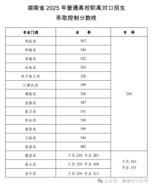 湖南省对口高考2025年本科录取分数线