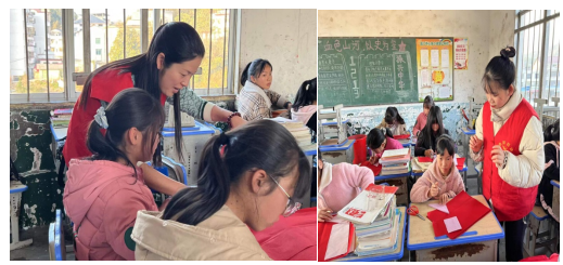罗辉云老师给课堂取了一个名字----“送春”,黑板上写着大大的“春”, 通过向孩子们展示了要教授的制作剪纸的步骤画图以及事先做好的成品。罗老师在讲台上一步一步的教着孩子们作品的每个步骤,并时不时走下讲台去查看孩子们的进度,对孩子们给予帮助,其他团员志愿者也在孩子们身边观察走动,指导孩子们完成一些“高难技艺”,密切关注着孩子们的操作,确保孩子们安全完成任务。一个个了不得的“春”作品慢慢诞生了!满满的自豪感映在了孩子们红扑扑的小脸上!